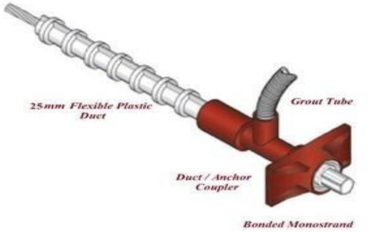 Concrete (in-situ) is poured first, and cables are stressed after concrete attained a specified compressive strength. One of the Internal Post-Tensioning Systems is Unbonded post-tensioning system – single (mono) strands coated with a corrosion-inhibiting